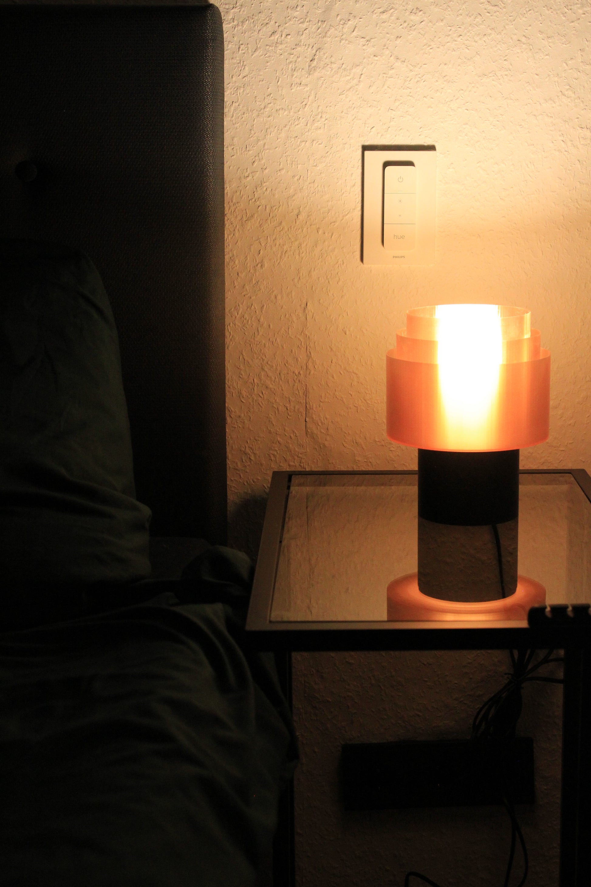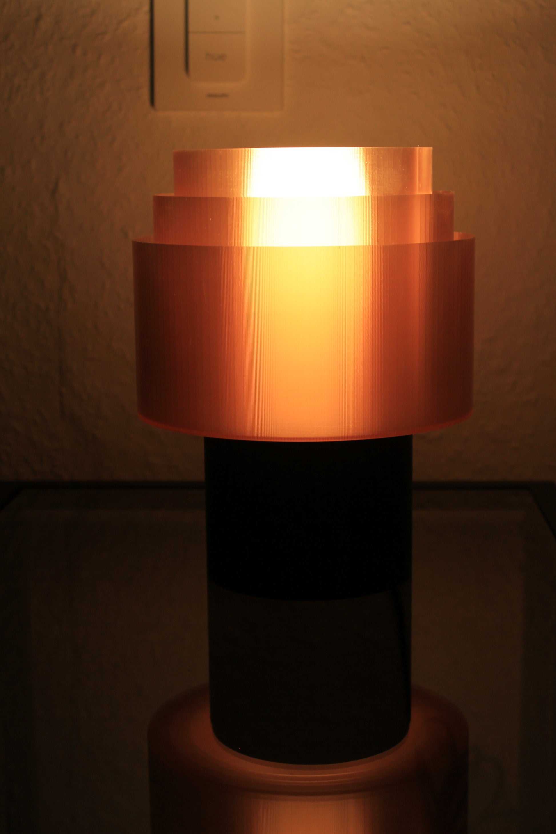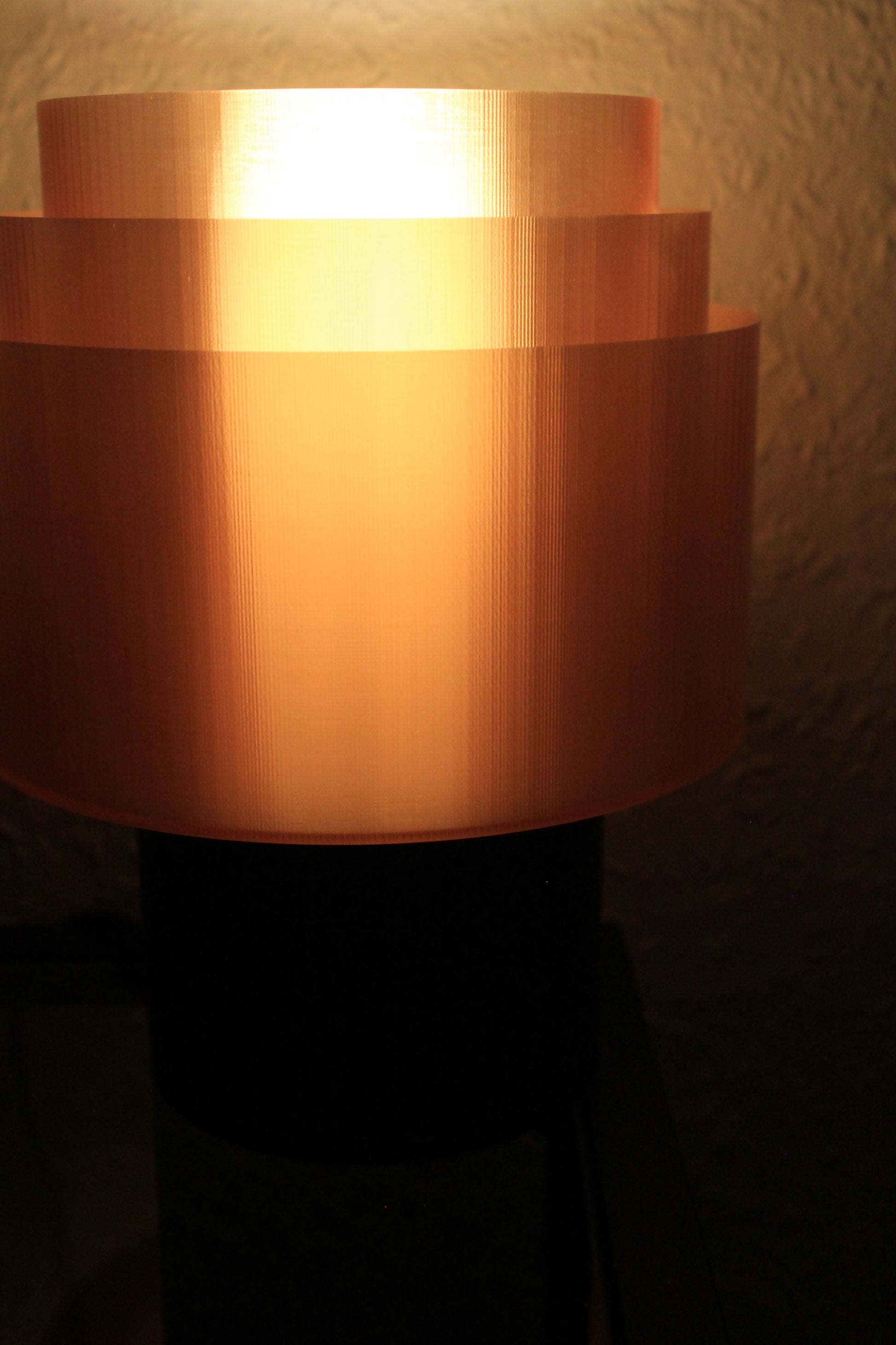 Der sorgfältig gefertigte Lampenschirm aus transluzentem, kupferfarbenem Filament sorgt für ein sanftes, gleichmäßiges Licht, das Räume in eine behagliche Stimmung taucht. Die harmonisch abgestuften Ringe brechen das Licht sanft und erzeugen ein faszinierendes Wechselspiel aus Glanz und Schatten.